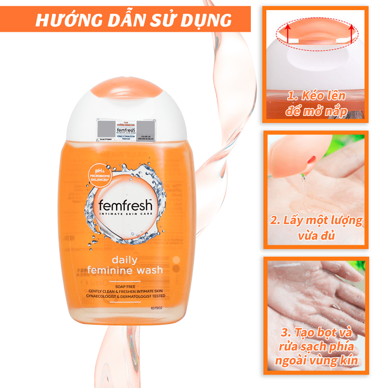 Làm ướt vùng kín, lấy 1 lượng vừa đủ GEL dung dịch vệ sinh ra tay khoảng 3ml ra tay, sau đó dùng tay làm sạch nhẹ nhàng vùng kín và rửa lại sạch với nước.